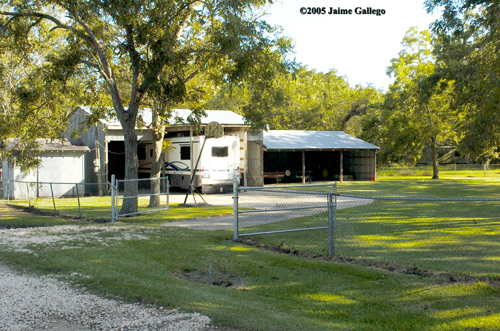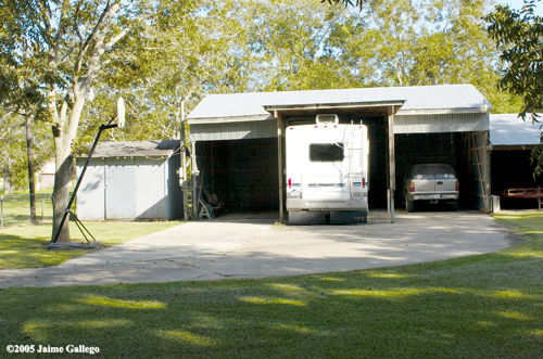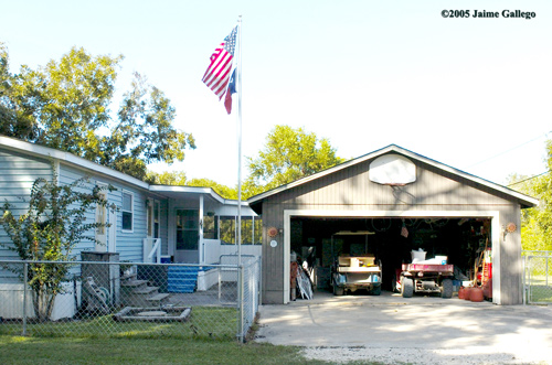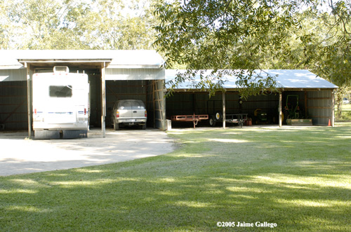 The workshop is on the left. You can also see a basketball goal with plenty of concrete for the court. There are also two mercury vapor security lights in this area.
